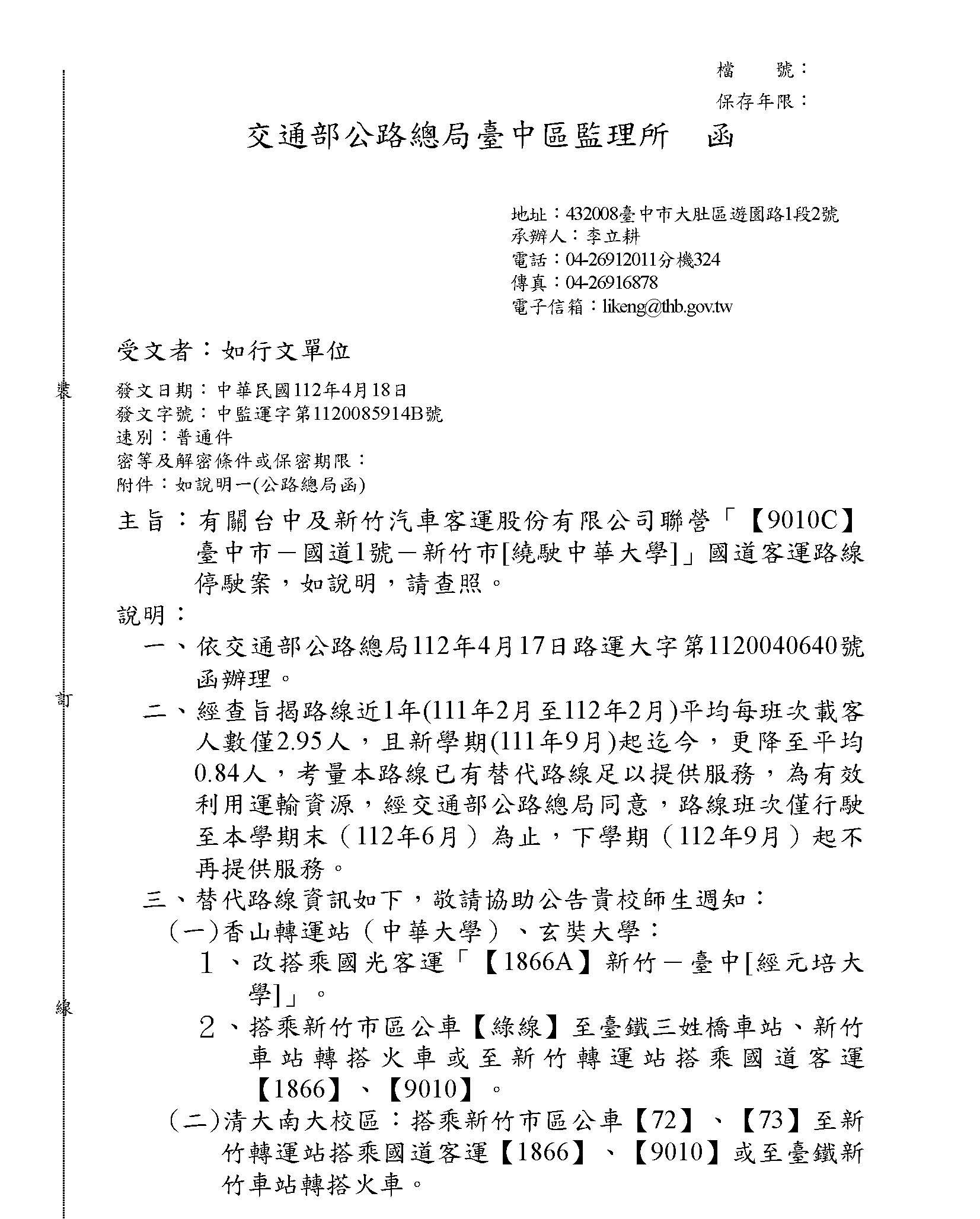 【9010C】臺中市-國道1號-新竹市[繞駛中華大學]國道客運路線,自112年 9月起停駛。