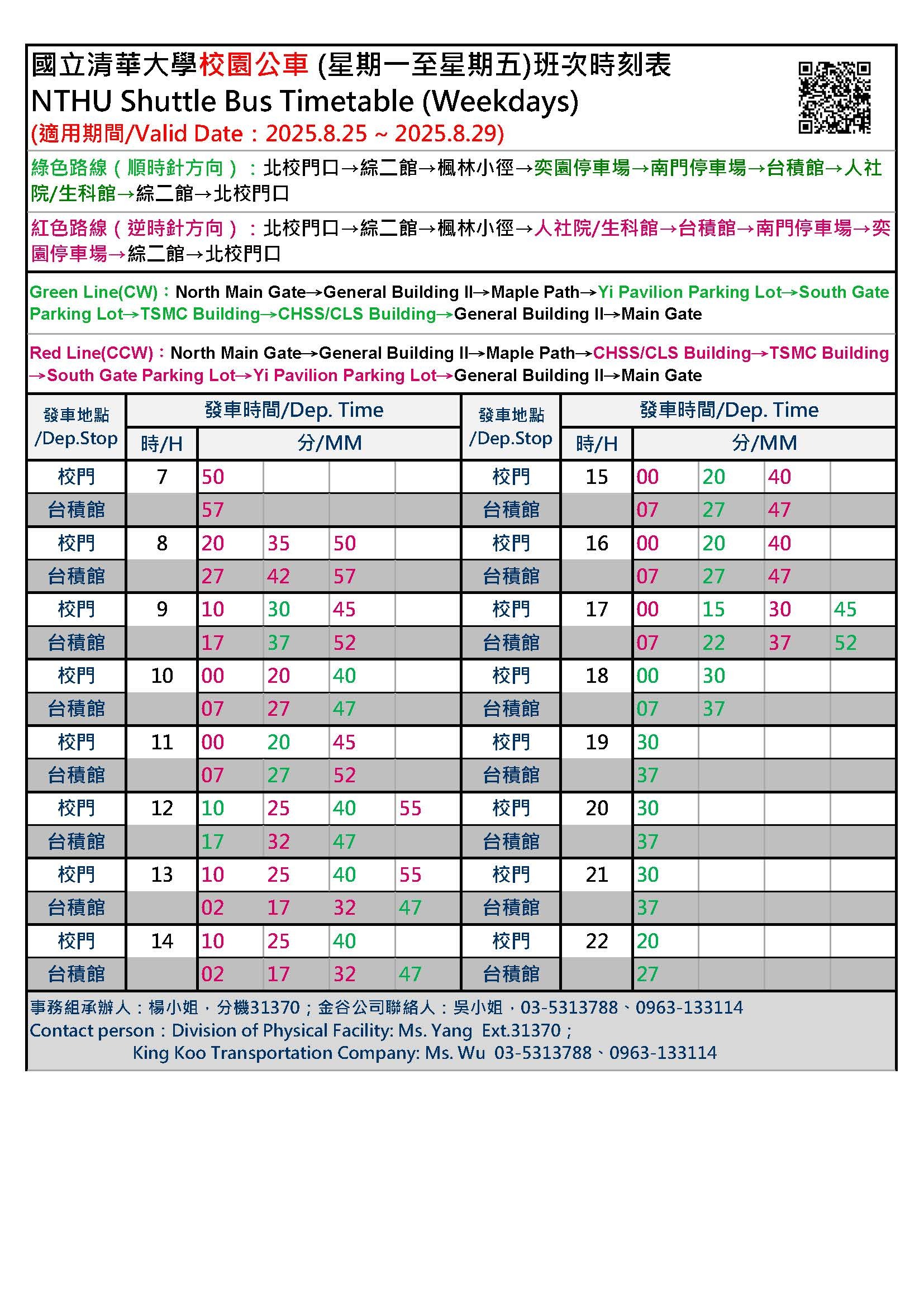 Renew NTHU Shuttle Bus Timetable 2025/8/25~2025/8/29.