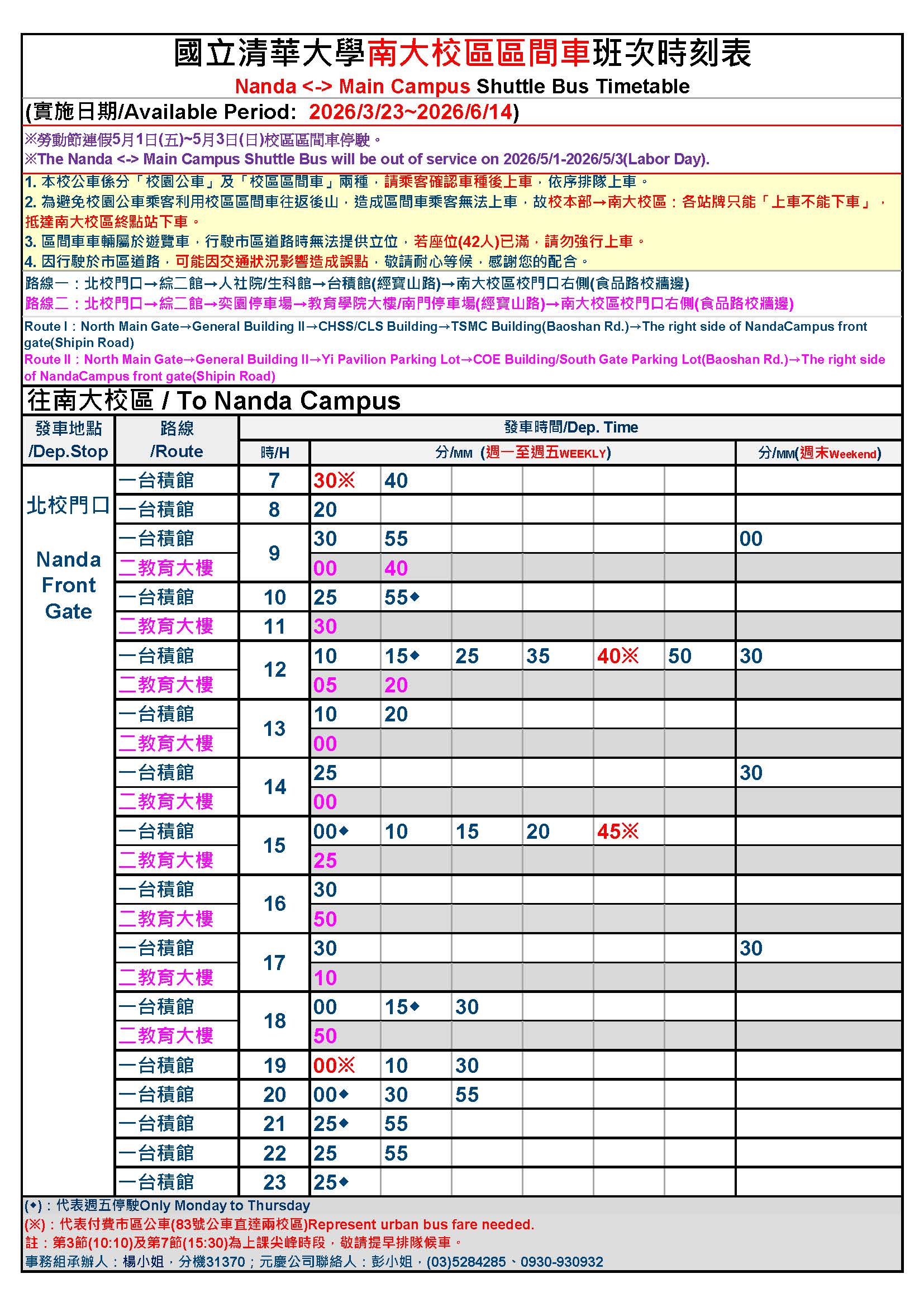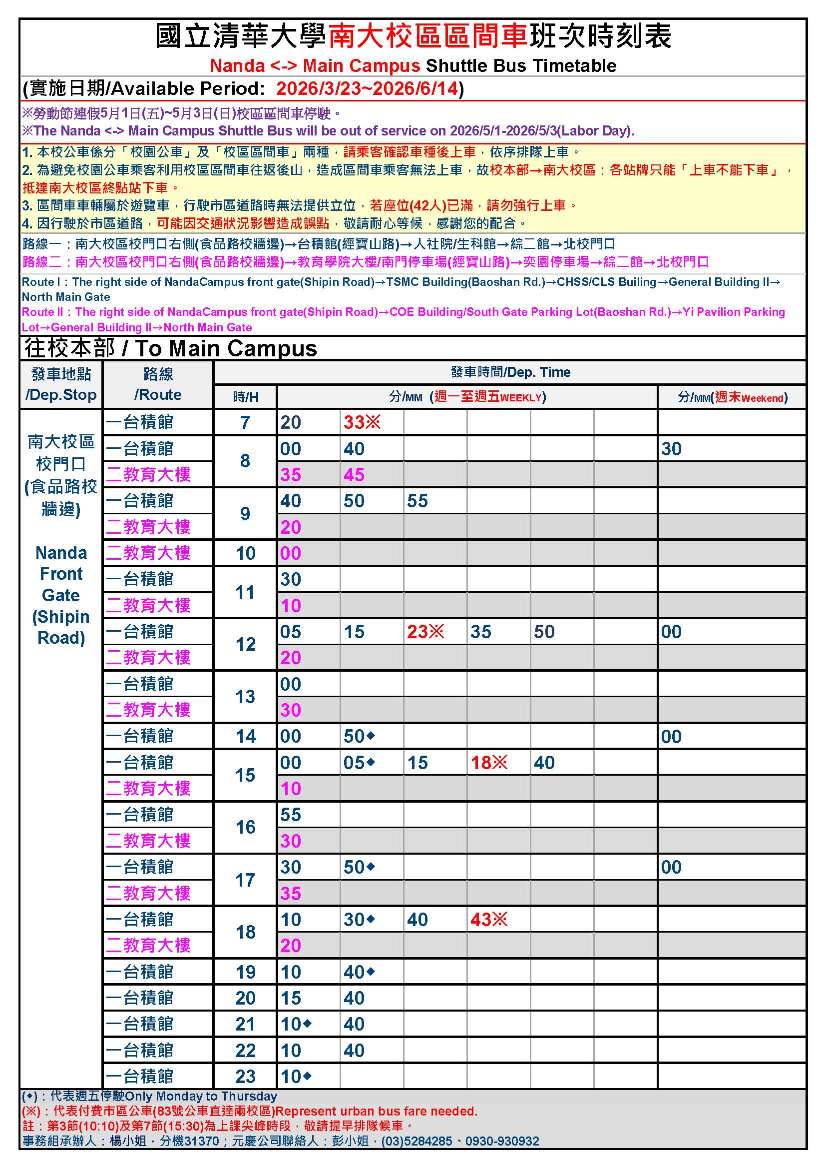 Nanda <-> Main Campus Shuttle Bus Timetable 2026/3/23~2026/6/14.